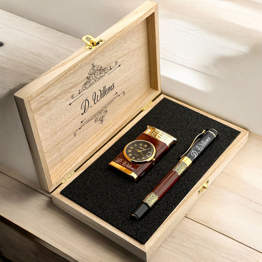 Persoonlijk Gegraveerde Aansteker met Horloge en balpen Geschenkset - In Houten Doos D2