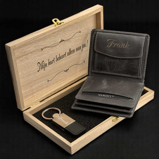 Luxe Cadeauset: Lederen Portemonnee, Horloge Aansteker in Houten Doos - Personaliseerbaar