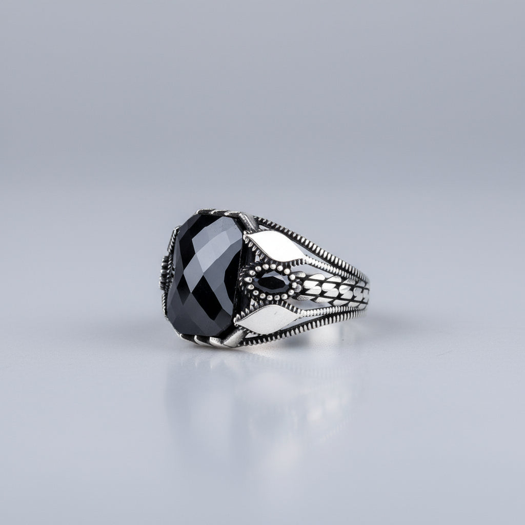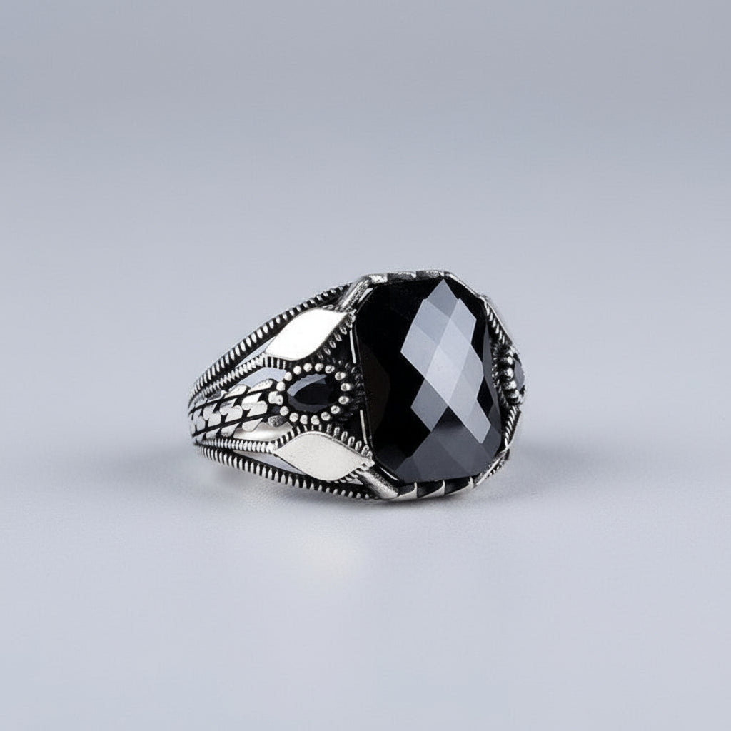Stijlvolle en krachtige herenring met een grote zwarte steen, vervaardigd uit 925 sterling zilver.