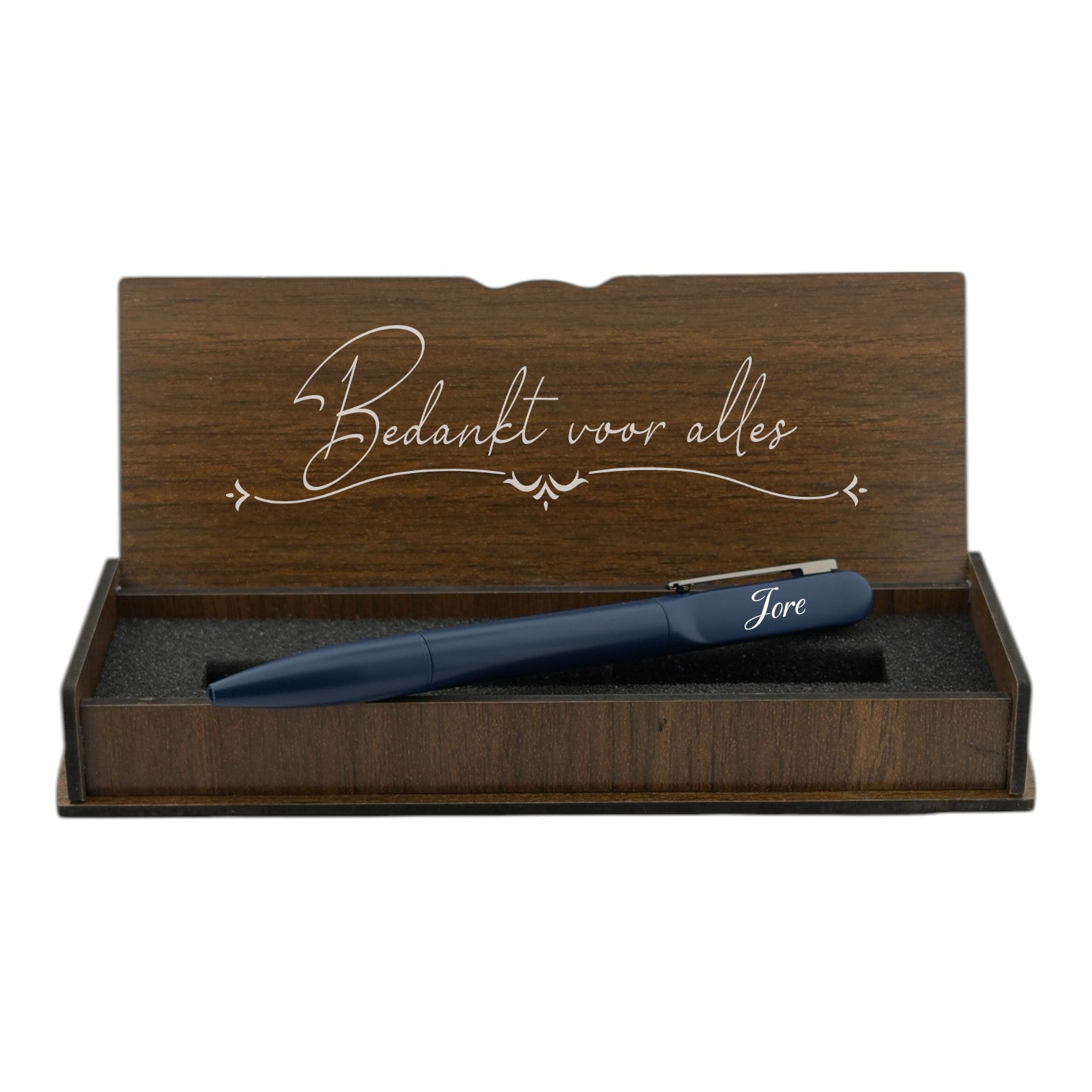 Luxuriöser Kugelschreiber aus Metall mit LED-Beleuchtung und Namensgravur – präsentiert in einer eleganten Geschenkbox aus Holz.