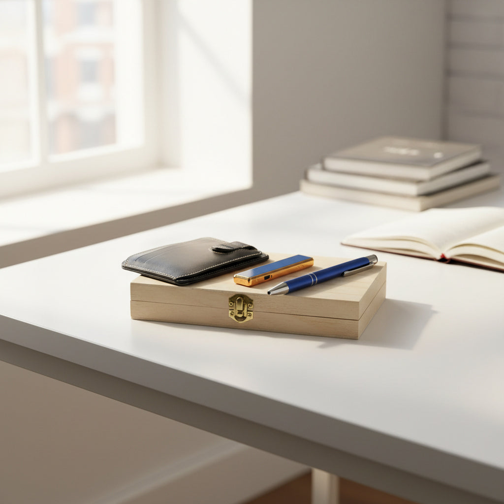 Luxurious wooden gift box with a leather card holder, electric USB lighter and ballpoint pen – personalized with name or text.