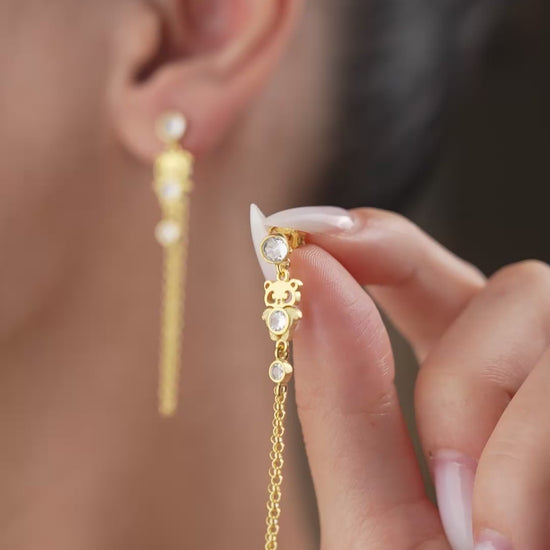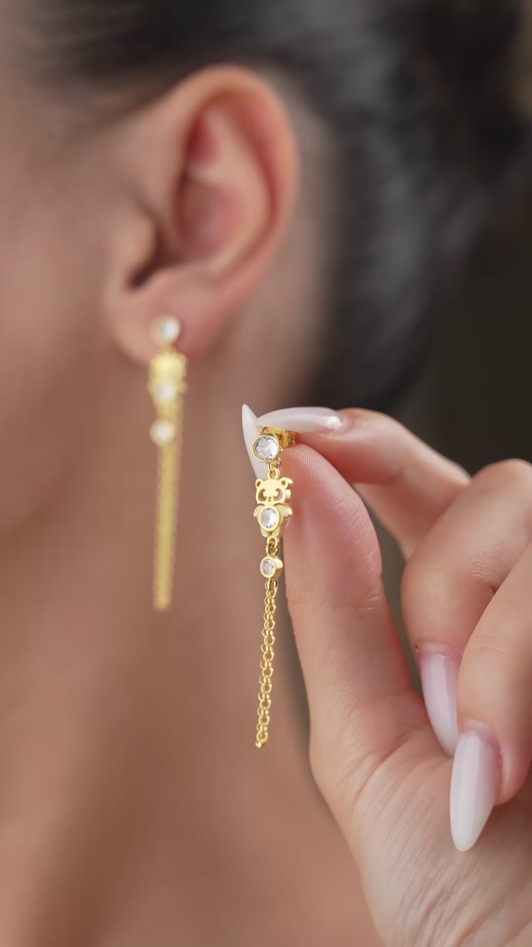 Gold-colored panda earrings with zirconia and elegant hanging chains.