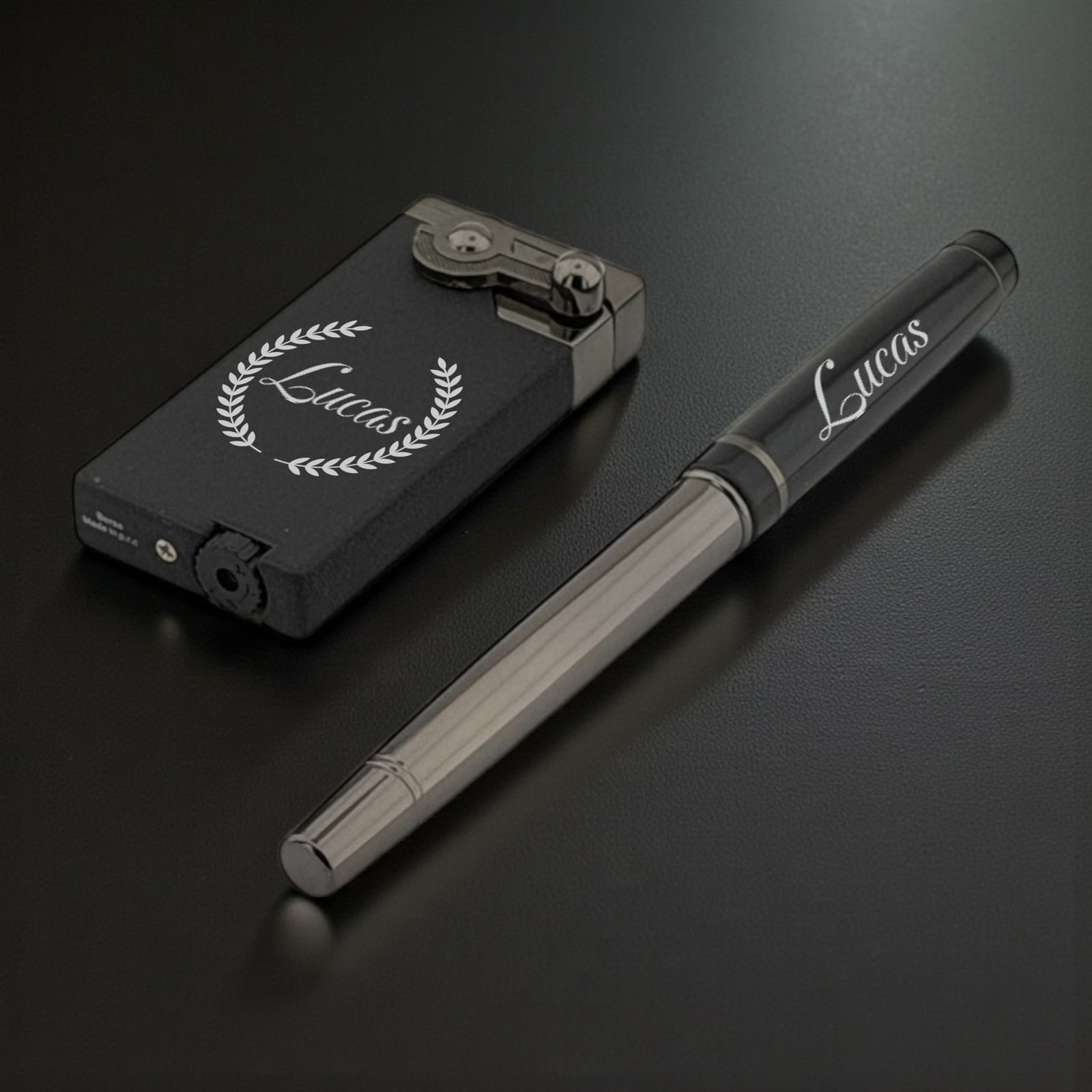 Luxe cadeauset met gegraveerde vulpen en gasaansteker, gepersonaliseerd met naam of handtekening.