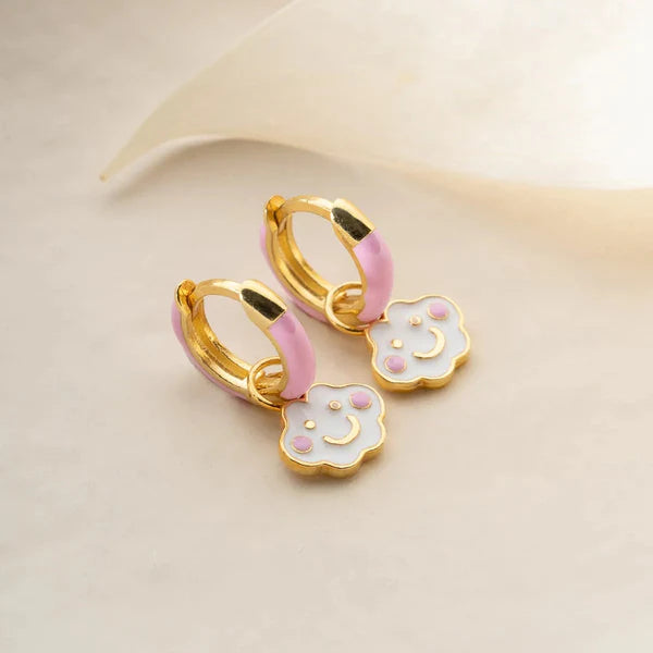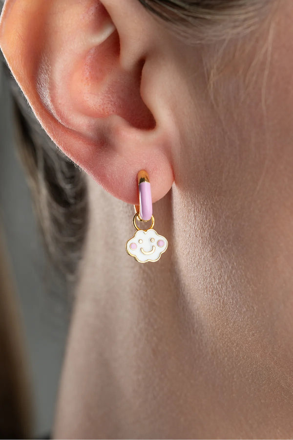 Vrolijke kinderoorbellen met een schattig lachend wolkje! Gemaakt van 925 sterling zilver, verguld met goud en afgewerkt met roze emaille details. Comfortabel, veilig en onweerstaanbaar lief voor kleine oortjes.
