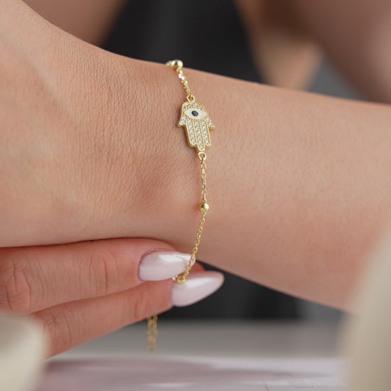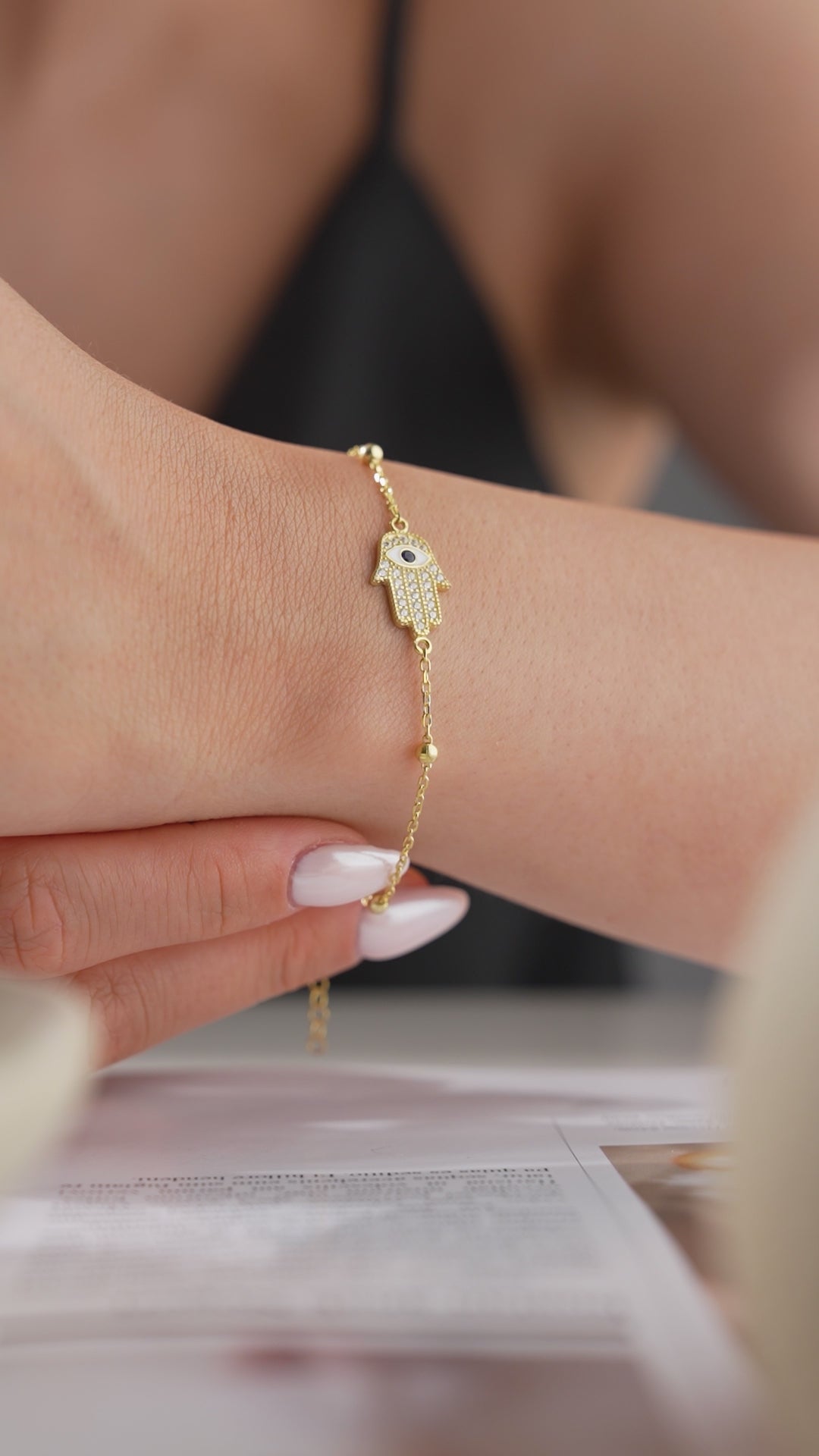 Deze verfijnde vergulde armband is versierd met de Hamsa hand, symbool van bescherming en kracht. De oogdetail beschermt tegen negatieve energie. Elegant én spiritueel – perfect voor elke gelegenheid.