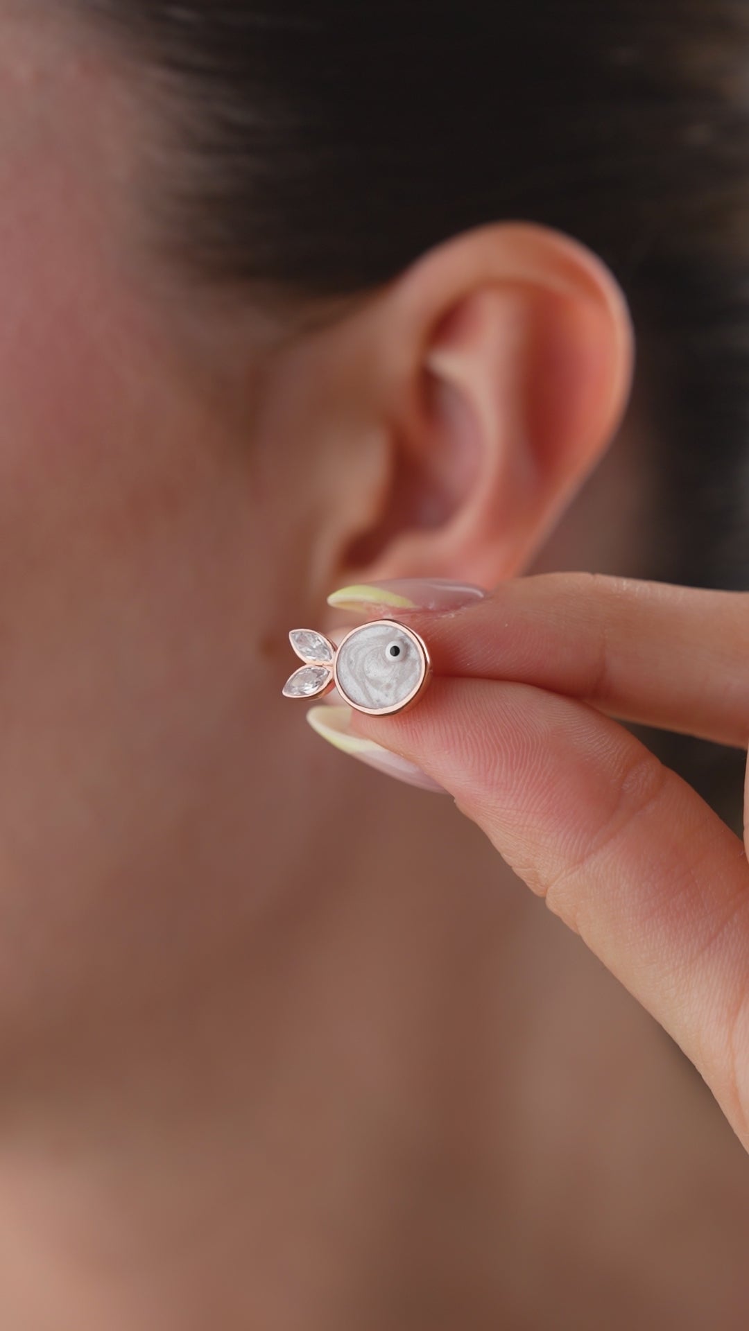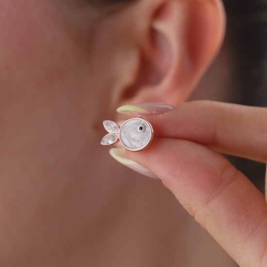 Solmare Oorbellen vangen de rust van de zee en zomerse warmte in een verfijnd, modern ontwerp. De visvorm met roségouden glans en fonkelende stenen geeft je look een subtiele elegantie.